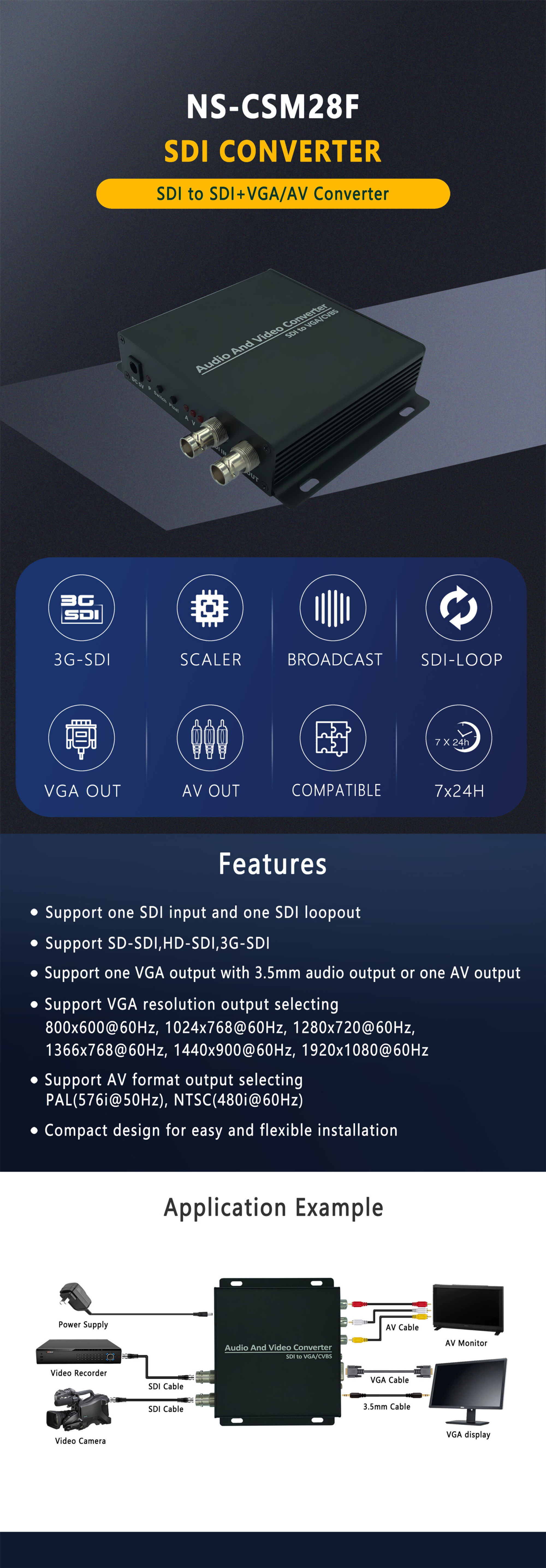 This SDI to SDI+VGA/AV converter is designed to converter 3G/HD/SD-SDI signal in broadcast industry to VGA or AV based equipment such as projectors,plasma TV, and LCD screens, etc. The device uses a chip designed professional scaler lossless technology, and applies wide range voltage DC5V-12V inside design which is suitable for professional project applications.