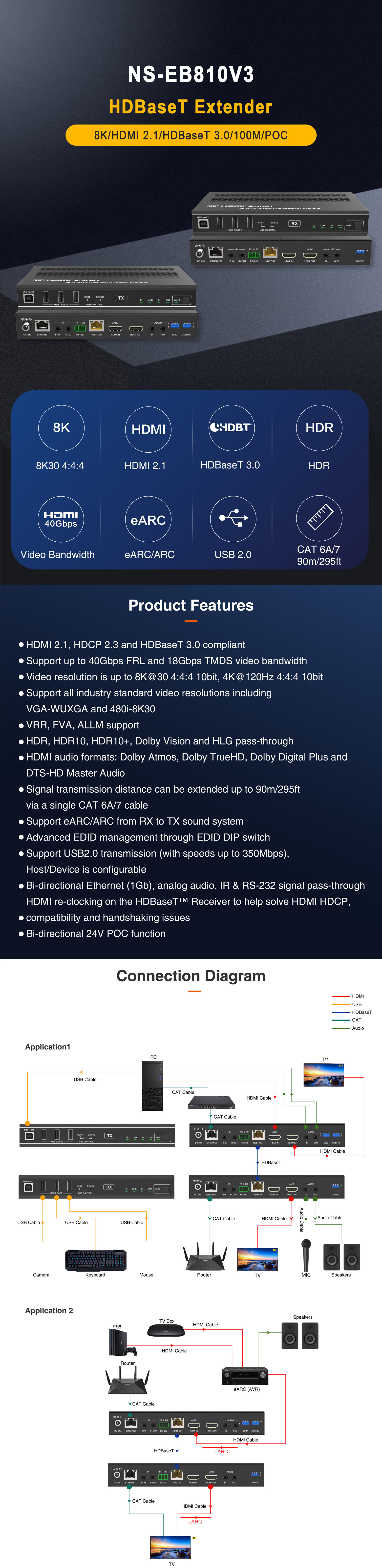 HD/UHD video and audio signals, eARC/ARC, RS-232, bi-directional IR,