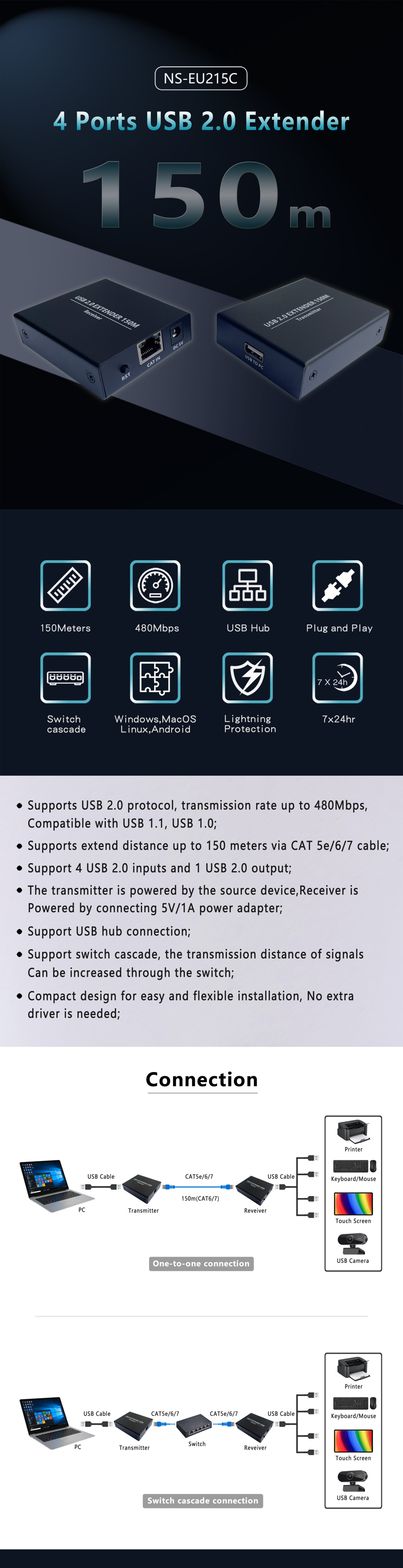 This is a USB 2.0 extender, can extend USB signal through CAT5e/6/7 network cables, with a transmission distance of up to 100m for CAT5e and 150m for CAT6/7 and above. Supports connection passes through the switch.It supports 4 channels of USB 2.0 device input, such as printer, camera, scanner, keyboard, mouse, USB flash drive,touchscreen, etc., and supports USB hub connection. Simple plug and play, no drive and setting installation required.