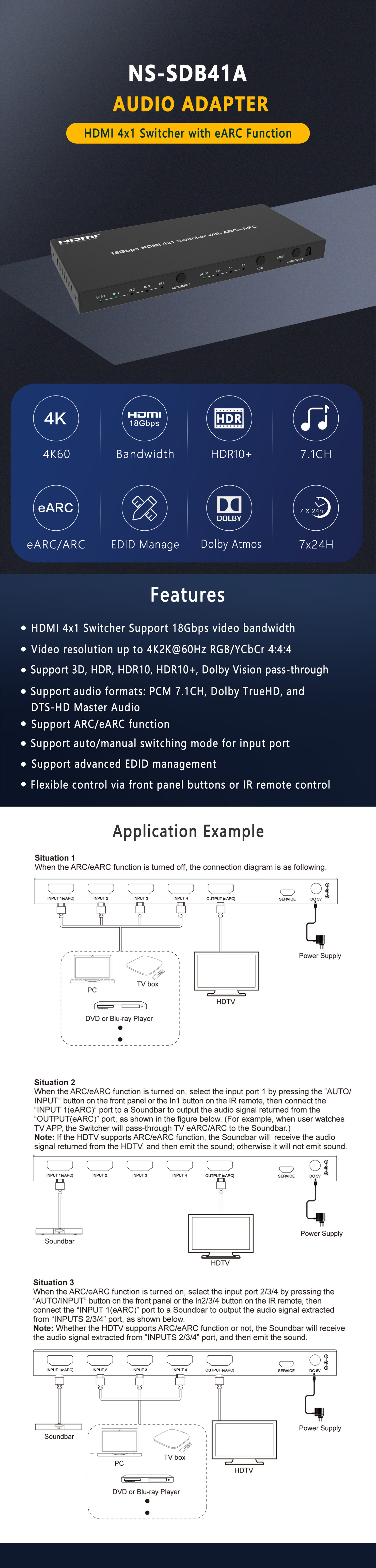 This 18Gbps HDMI 4x1 Switcher can switch any four HDMI sources to one HDMI display. It supports video resolution up to 4K2K@60Hz RGB/YCbCr 4:4:4. It supports ARC/eARC function (only for the “INPUT 1(eARC)” port), 10bit HDR and CEC function. It also supports advanced EDID management (AUTO/2.0CH/5.1CH/7.1CH selectable). Flexible control via front panel buttons and IR remote control.